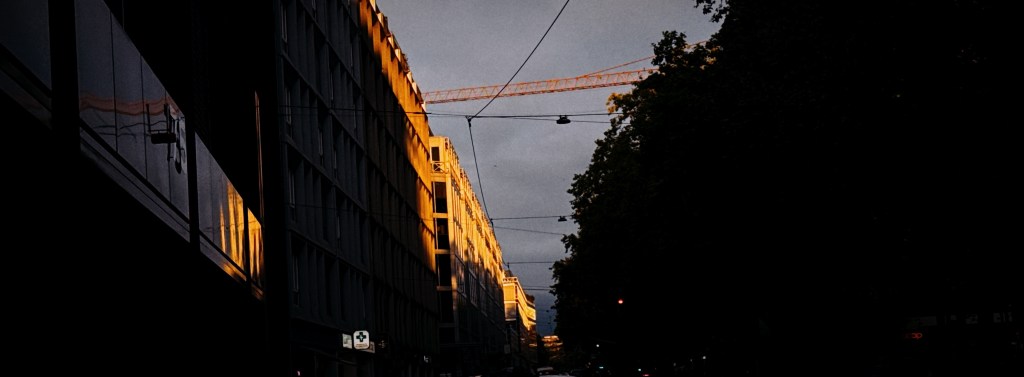 En vitesse je me rase, je me douche, je prépare le café dans la cafetière italienne une tasse, je trace vers la gare. Un peu avant huit heures, route des Franchises, la montagne à l’horizon est ce matin engloutie par les nuages. Je me retourne : le soleil maintenant levé dore de ses rayons encore un peu endormis le glacis des immeubles modernes, rasant leur surface sans pouvoir s’y fixer. Toute la journée j’ai l’impression de flotter sur un nuage, un nuage de macroblocks comme dans un plan de Sandro Koberidze.
